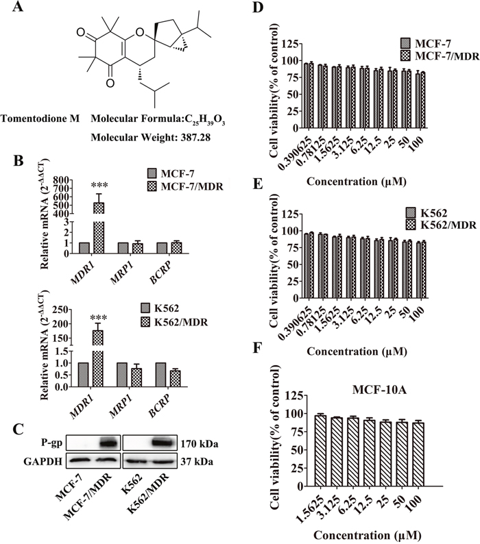 Figure 1: Effect of TTM on cancer cell toxicity and expression of ABC transporters. (A) Chemical structure and molecular weight of Tomentodione M (TTM). (B) QRT-PCR analysis of MDR1, MRP1 and BCRP mRNA levels relative to GAPDH in parental and multi-drug resistant (MDR) MCF-7 and K562 cancer cells. Note: The relative mRNA levels are expressed as fold-changes relative to control group, which is arbitrarily represented as 1. The data are representative of at least 6 replicates. (C) Representative western blot showing P-gp protein levels in MCF-7/MDR and K562/MDR cells relative to their corresponding parental cells. GAPDH was used as loading control. (D-F) MTT and CCK-8 assays showing cell viability of multidrug resistant cell lines (MCF-7/MDR and K562/MDR) and their corresponding parental cell lines (MCF-7 and K562), as well as non-tumor cell line (MCF-10A) treated with 0-100 μM TTM for 48 hr. Inhibition of cell proliferation by different concentrations of TTM were calculated based on the ratio of absorbance in treatment and control samples. The absorbance was evaluated at a test wavelength of 570 nm, and a reference wavelength of 630 nm in MTT assays. The absorbance at 450 nm was used in CCK-8 assays. Note: Values represent mean ± SEM from three independent experiments. *** denotes P < 0.001 compared to control.