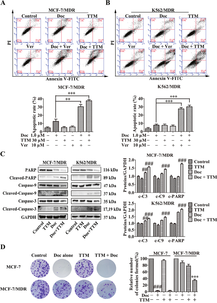 Apoptosis was evaluated by FACS consistent with the manufacturer’s instructions. Sensitive cells and MDR cells were treated with (+) or without (-) 30 μM TTM combined with 1.0 μM Doc for 48 hr. Cells were then washed twice with cold PBS, suspended in 100 μL of binding buffer at a concentration of 1 × 106 cells/mL. After that, cells were incubated with fluorescein isothicocyannte (FITC)-conjugated annexin V reagent and PI in binging buffer for 30 mins at room temperature as described by the manufacture and finally determined by FACS.