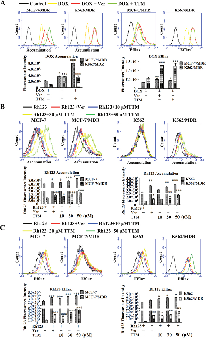 To further visualize the effect of TTM on the intracellular retention of Rh123, 5 × 103 cells per well were seeded in the 96-well plate for overnight. The cells were treated with TTM (10, 30 μM) for 48 hr, and were then incubated with 10 μM Rh123 alone or 10 μM Rh123 combination with TTM in the fresh RPMI 1640 medium for 1.5 hr in darkness at 37 °C. After that cells were washed 3 times with cold PBS and images were acquired by the laser confocal.