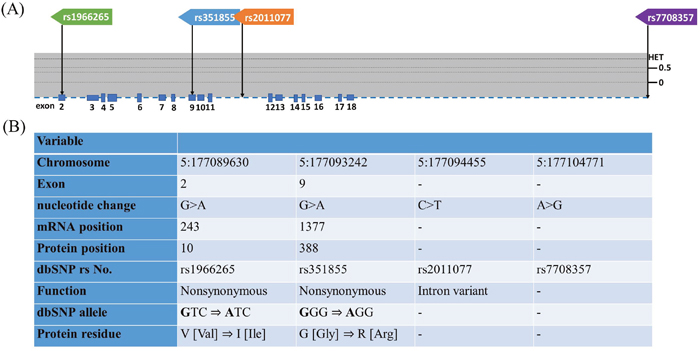 Figure 1: Exon and intron position of FGFR4 gene in human and FGFR4 gene polymorphisms assessed in study. (A) The position of four SNPs of FGFR4 gene from the chromosome chr 5:177089630 to 177104771 (reference genome GRCh38.p7). The lower panel shows population-specific heterozygosity frequencies of this polymorphism in East Asian population (HAPMAP-CHB). (B) FGFR4gene polymorphisms assessed in this study.