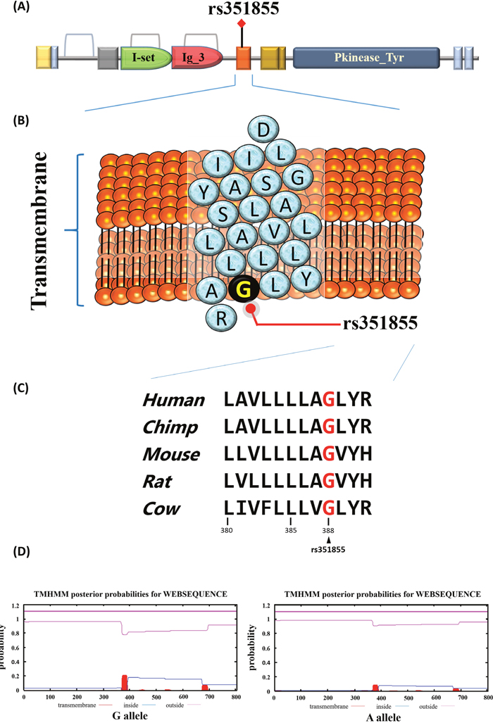 Figure 2: Functional implication and In silico profiling of FGFR4 SNP rs351855. (A) Schematic representation of the full-length human FGFR4 protein domain organization. The orange represent the transmembrane that rs351855 was located in this region. (B) Ribbon diagram depicts the transmembrane of rs351855. The blue circles represent amino acids abbreviation and the black circle represents the rs351855 residue change. (C) Mammalian of FGFR4 proteins sequences showed in this alignment. Human (homo, NM_002011.4), chimp (Pan troglodytes, NC_006472.4), mouse (mus, NM_008011.2), rat (rattus norvegicus, NM_001109904.1), and cow (bos taurus, NM_001109904.1). (D) Prediction of transmembrane helices in rs351855.