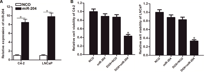 Figure 2: Restore of miR-204 enhanced the cytotoxicity of DOX against PCa cells. (A) QRT-PCR analysis was performed to test the effect of miR-204 mimic on increasing the cellular miR-204 in C4-2 and LNCaP cells. *P<0.05. (B) MTT assays were performed to test the effect of miR-204 and DOX (0.5 μM) on cell viability of C4-2 and LNCaP cells. *P<0.05 vs. DOX+NCO group.