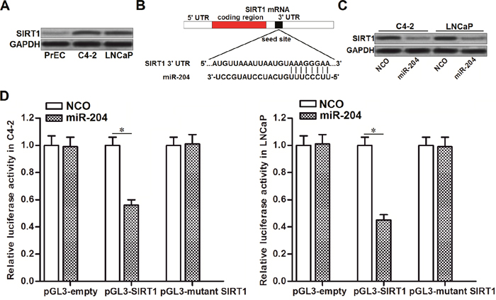 Figure 3: MiR-204 targets SIRT1 in PCa. (A) Western blot analysis was performed to evaluate the protein level of SIRT1 in PrEC, C4-2 and LNCaP. (B) Complementary binding sequence between miR-204 and SIRT1 3’ UTR was predicted by TargetScan database. (C) Effect of NCO and miR-204 on changing the protein level of SIRT1 in C4-2 and LNCaP cells. (D) Western blot analysis was performed to evaluate the role of miR-29b in changing the expression of SIRT1 in SW480 and OR-SW480 cells. (D) C4-2 and LNCaP cells were co-transfected with SIRT1 3’ UTR reporter plasmid plus miR-204 or NCO. 48 h later, luciferase activities were determined by dual-luciferase reporter assay system. *P<0.05.