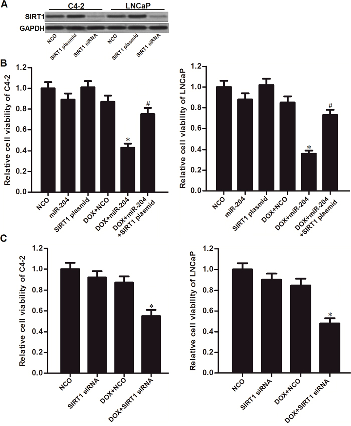 Figure 4: MiR-204 enhanced the cytotoxicity of DOX through decreasing the expression of SIRT1 in PCa. (A) Effect of SIRT1 plasmid and siRNA on changing the expression level of SIRT1 in C4-2 and LNCaP cells. (B) Overexpression of SIRT1 abolished the effect of miR-204 on enhancing the DOX-induced (0.5 μM) cell death in C4-2 and LNCaP cells. *P<0.05 vs. DOX + NCO group, #P<0.05 vs. DOX + miR-204 group. (C) Knockdown of SIRT1 dramatically increased the cytotoxicity of DOX (0.5 μM) to C4-2 and LNCaP PCa cells. *P<0.05 vs. DOX + NCO group.