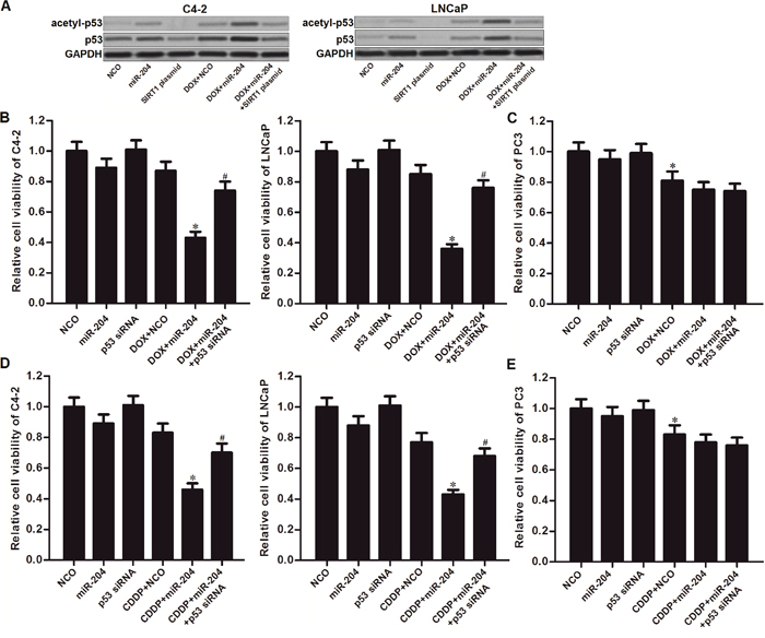 Figure 5: MiR-204 promotes DOX-induced acetylation of p53 in Pca. (A) Effect of DOX (0.5 μM), miR-204 and SIRT1 plasmid on changing the acetylation of p53 in C4-2 and LNCaP cells. (B) Knockdown of p53 abolished the effect of miR-204 on enhancing the DOX-induced (0.5 μM) cell death in C4-2 and LNCaP cells. *P<0.05 vs. DOX + NCO group, #P<0.05 vs. DOX + miR-204 group. (C) MiR-204 failed to promote the DOX-induced (0.5 μM) cell death in p53-null PC3 cells. *P<0.05 vs. NCO group. (D) MiR-204 enhanced the CDDP-induced (2 μM) cell death in C4-2 and LNCaP cells. *P<0.05 vs. CDDP + NCO group, #P<0.05 vs. CDDP + miR-204 group. (E) MiR-204 failed to promote the CDDP-induced (2 μM) cell death in p53-null PC3 cells. *P<0.05 vs. NCO group.