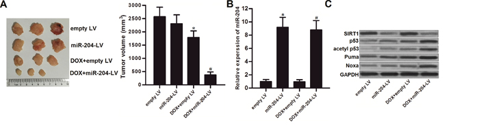 Figure 7: MiR-204 enhances the anti-tumor effect of DOX on LNCaP in vivo. (A) 31 days post inoculation with lentivirus-transduced LNCaP, the final tumor volumes were measured. *P<0.05 vs. empty LV group, #P<0.05 vs. DOX + empty LV group. (B) The final tumor tissues cells were purified with collagenase type III. Expression of miR-204 in these tumors was detected by qRT-PCR analysis. *P<0.05 vs. empty LV group, #P<0.05 vs. DOX + empty LV group. (C) Protein levels of SIRT1, p53, acetyl p53, Puma and Noxa in the purified tumor tissues cells were detected by western blot analysis.