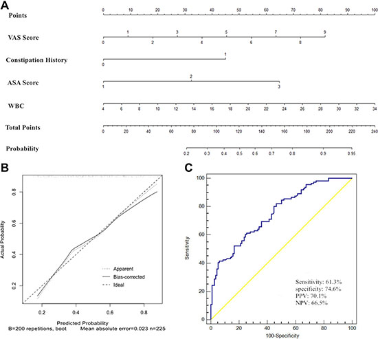 Figure 1: Nomogram, its receiver operating characteristics (ROC) curve and Nomogram calibration plot for predicting postoperative TFI after gastrectomy with lymphadenectomy. (A) Nomogram from the final multivariable analysis of the binary logistic regression model. (B) Nomogram calibration plot. Diagonal reference line indicates the ideal relationship between predicted and actual occurrence of TFI. The mean absolute error was 0.023. (C) ROC curve and its diagnostic performance.