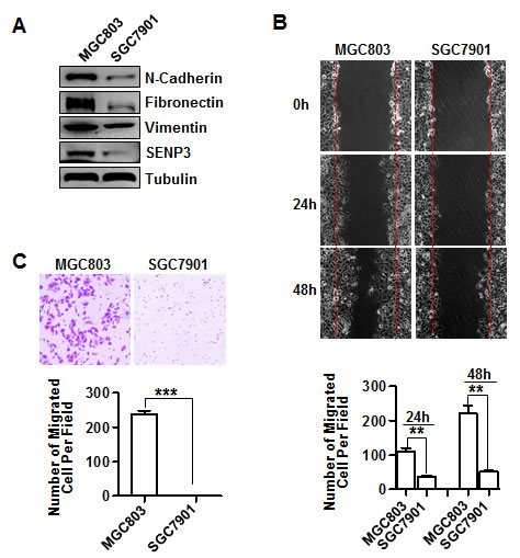 Figure 1: SENP3 expression correlates with the EMT in gastric cancer cells. (A) The expressions of EMT marker genes and SENP3 in SGC7901 and MGC803 cells were assessed by immunoblotting. (B) Representative images of wound-healing in SGC7901 and MGC803 cells were shown. The number of migrated cells within the areas of healing surpassing the red lines was calculated, and each experiment was repeated 3 times. **: P < 0.01. (C) Representative images of transwell assays (6 hours) in SGC7901 and MGC803 cells were shown. The number of migrated cells on the surfaces of membrane was calculated in 3 fields respectively, and each experiment was repeated 3 times. ***: P < 0.001.