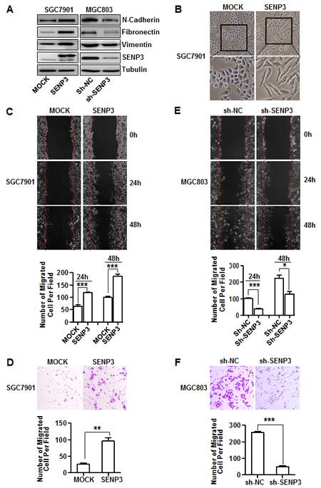 Figure 2: SENP3 induces the EMT in gastric cancer cells. (A) The protein levels of EMT markers and SENP3 in the stable cell lines SGC7901-SENP3 (SENP3 overexpression) and MGC803-sh-SENP3 (SENP3 knockdown). (B) Cell morphology of SGC7901 cells with or without SENP3 overexpression. (C, D) Representative images of wound-healing (C) and transwell assays (D) in SGC7901-MOCK and SGC7901-SENP3 cells were shown. (E, F) Representative images of wound-healing (E) and transwell assays (F) in MGC803-sh-NC and MGC803-sh-SENP3 cells were shown. Transwell assays in SGC7901-SENP3 (8 hours) and MGC803-sh-SENP3 (6 hours). The number of migrated cells was calculated as in Figure 1B, C, and each experiment was repeated 3 times. ***: P < 0.001, **: P < 0.01, *: P < 0.05.
