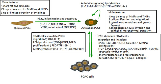 Generally, there are two main PSC statuses: quiescent and activated. Most quiescent PSCs store fat and retinoids in perinuclear droplets and express glial fibrillary acidic protein (GFAP). And the quiescent phenotype of PSCs could be defined via presence of lipid droplets in the cytoplasm [8, 13, 14]. Quiescent PSCs play a role in maintaining ECM growth and keeping the balance between secreted matrix metalloproteinase (MMP) and tissue inhibitors of MMP (TIMP). Some have argued that quiescent PSCs may also have immune and intermediary functions [14–17]. Quiescent PSCs could be activated in harmful conditions such as stress or inflammation, and the activation was demonstrated to be related to autophagy [18], an alternative metabolic pathway allowing tumor cells to obtain energy [19]. In addition, a recent study found that PSC activation levels could vary according to the microenvironment [20]. The typical features of activation are the expression of α-smooth muscle actin (α-SMA) and a significant quantity expression of ECM proteins (including collagen, laminin, fibronectin) [21]. In PDAC, the activation of PSC contributes to improved tumor cell initiation, development, evasion of immune surveillance, invasion, metastasis, and resistance to chemoradiation [22–24]. Moreover, activated PSCs can produce soluble factors such as transforming growth factor β (TGF-β); interleukin 1, 6, 8 (IL-1, IL-6, IL-8); stromal cell-derived factor-1 (SDF-1); hepatocyte growth factor (HGF), galectin-1 etc. to participate in PDAC cell formation and malignant behaviors. Chronic pancreatitis (CP), which is characterized by massive fibrosis, was demonstrated to be the potential precursors of PDAC [25, 26]. Previous study illustrated that fibrosis is the common feature of PDAC and CP, and PSCs are responsible for the promotion and maintenance of fibrosis [27]. Some PSC-derived cytokines such as TGF-β and fibroblast growth factor (FGF) could contribute to the synthesis of ECM, which leads to the development of fibrosis in CP [28]. Moreover, TGF-β, FGF, platelet-derived growth factor (PDGF) were demonstrated to contribute to the malignant transformation in CP [29], and that could be the reason for carcinogenesis of activated PSC in CP. A recent study argued that TGF-β, FGF and interleukin could activate autophagy in PDAC cells [18], and autophagy dependent alanine secreted by PSCs played a role in pancreatic cancer metabolism. This autophagy process was proven to be stimulated by PDAC cells in turn [30]. Furthermore, PDAC cells can interact with PSCs via the similar soluble factors, stimulating the PSC inflammatory profile, proliferation, and ECM and MMP synthesis, forming a vicious cycle [27, 31] in PDAC (Figure 1).