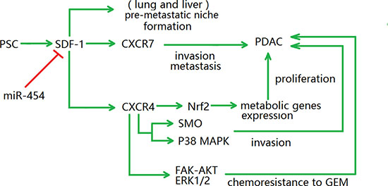 There are several signaling pathways of SDF-1-induced invasion and metastasis in PDAC, and their mechanisms are diverse [89]. A recent study found that a SDF-1-targeting miRNA, miR-454, plays a role in TAM recruitment, which has value for understanding the mechanisms underlying tumor growth [90]. Some studies have shown that high SDF-1 expression levels are related to poor outcome of PDAC [91]. Interestingly, for many years, it was assumed that CXCR4 was the only SDF-1 receptor; however, recent studies have demonstrated that CXCR7 is a novel receptor of SDF-1 involved in several aspects of tumor invasion and metastasis in PDAC [81, 91, 92]; Liu et al. reported that SDF-1 and CXCR7’s expression in the ductal cells were related with poor prognosis, as the median survival time of SDF-1+CXCR7+ patients was 6 months while that of SDF-1−CXCR7− patients was 10 months [81]. In addition, there is cross-talk between the SDF-1 subtype SDF-1α and IL-6 signaling, which promoted tumor cell proliferation and chemoresistance in PDAC [84]. Moreover, a recent study asserted that PSC-secreted IL-6 and SDF-1α were responsible for nuclear factor erythroid 2 (NRF2) activation in PDAC cells. The expression of metabolic genes was upregulated by NRF2, which then promoted the detoxification of ROS and the synthesis of purine nucleotides, leading to PDAC cell proliferation [84, 93]. Another meaningful cross-talk is between the SDF-1/CXCR4 axis and the non-canonical Hh pathway [94]; the latter was usually considered to function in developing embryos [95]. It has been illustrated that the SDF-1/CXCR4 axis could promote the expression of smoothened, a vital protein in the Hh pathway whose overexpression can induce tumor cell EMT and invasion. To conclude, the cross-talk between SDF-1 and other signaling pathways provides a novel platform for deeper understanding of the mechanisms involved in SDF-1-induced invasion and metastasis in PDAC (Figure 2).