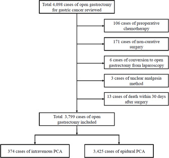 Figure 1 shows the flowchart of patient sample selection. The data of 4, 098 patients were reviewed for analysis. Among these patients, 106 cases that received preoperative chemotherapy and 171 cases that underwent non-curative surgery were excluded. Additionally, 6 cases of laparoscopic gastrectomy that were converted to laparotomy, 3 cases of unclear analgesia method, and 13 cases of patient death within 30 days after surgery were excluded from analysis.