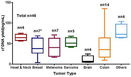 cfDNA yield varied among different tumor types. The median amount of cfDNA isolated per mL of plasma was 39 ng per mL (range, 4–763.9 ng). Patients with brain tumors has lower yield as compared to other tumor type tested (Figure 1; Supplementary Table 1).