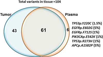 Figure 3: Concordance between mutations detected in tissue and plasma cfDNA by NGS. Sixty one out of 104 expected mutations were detected in both tissue derived genomic DNA and plasma cfDNA. 43 mutations detected in tissue was not present in plasma. Six additional mutations TP53p.Y220C (1.5%) EGFRp.E602G (5%), EGFRp.F712S (1%), PIK3CAp.E542K (1.1%), TP53p.R273H (1%) and APCdupAp.I1311fs*4 (1.5%) were detected in plasma cfDNA only.
