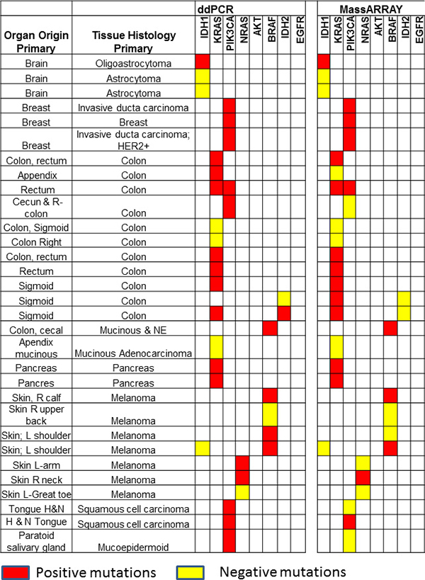 Figure 4: Comparison of ddPCR and ultraSEEK MassARRAY for mutation detection in plasma cell free DNA: A total of 35 variants in 31 samples were compared between ddPCR and MassARRAY. MassARRAY showed 80% concordance for mutation detection with ddPCR (R2 = 0.9253; p < 0.0001). Red boxes represent positive mutations and yellow boxes represent negative mutations detected by ddPCR or MassARRAY.
