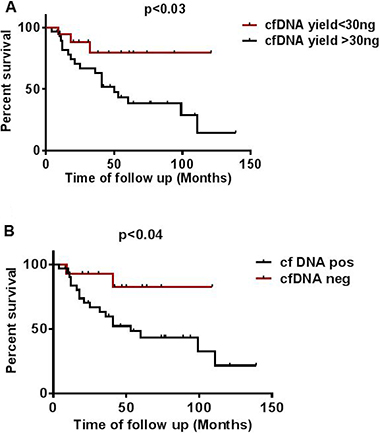 Figure 6: Effect of cfDNA yield and mutation status on overall survival. (A) Effect of higher (> 30 ng) and lower (< 30 ng) cfDNA yield on overall survival (B) Effect of mutation status detected in cfDNA on overall survival calculated from time of collection of plasma in patients undertaken for study.