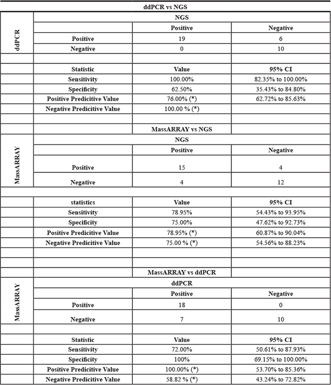 Table 2: Clinical performance of ddPCR, MassArray and NGS test for mutation detection in plasma cfDNA