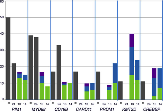 Figure 2: Comparison of the distribution of recurrently mutated genes in DLBCL cohorts: The percentage of mutated cases for each gene represented were obtained from the following data: *our data; [13, 14, 24]. The distribution of mutations according to cell of origin (COO) in each series were represented when available. Grey: COO non-classified; green: non-GCB DLBCL, Blue: GCB DLBCL; purple: others