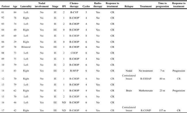 Abbreviations: R-CVP: Rituximab, Cyclophosphamide, Vincristine, Prednisone; R-CHOP: Rituximab, Cyclophosphamide, Doxorubicin, Prednisone; R-MVP: Rituximab, Methotrexate, Vincristine, Procarbazine; R-COMP: Rituximab, Cyclophosphamide, Myocet, Prednisone; R-ESHAP: Rituximab, Etoposide, Methylprednisolone, Cytarabine, Cisplatin; CR: Complete response; ND: No data; m: months