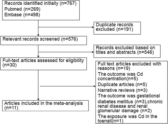 Following development of our search strategy, 767 records were initially identified. A total of 191 duplicate studies were excluded, 576 were subsequently screened, and 408 were excluded because titles and abstracts did not fit our criteria. Thirty full-text articles were reviewed for further assessment. Five articles were excluded because they were duplicate publications [14, 15, 22, 24, 28]; another five were excluded because Cd content was measured [33–37], three studies were excluded because the outcome was gestational diabetes mellitus [17, 18, 25], three were reviews [38–40], two were excluded because outcomes were related to chronic kidney disease [41] or renal glomerular damage [42] and one was excluded because the exposure was Cd in the toenail [13]. Finally, eleven studies met meta-analysis criteria and were included (Figure 1).