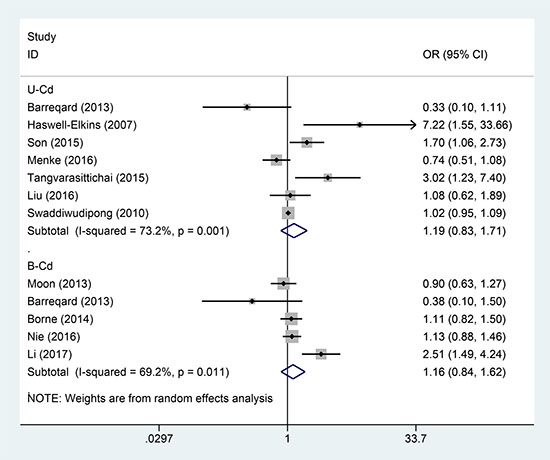 The present meta-analysis exhibited several strengths. First, this study was the first to investigate association between Cd exposure and DM risk. Second, large sample size improved risk estimate accuracy and resulted in well-founded conclusions based on meta-analysis. Pooled estimates were robust across sensitivity and subgroup analyses, and publication bias was not detected. Conclusions from combined estimates were more reliable than from single studies because overall OR was based on large sample size and exhibited sufficient power.
