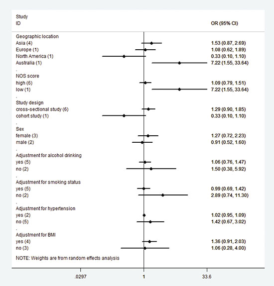 Seven studies examined the association of U-Cd concentration with risk of DM. The overall OR was 1.19 times (odds ratio (OR) = 1.19; 95% confidence interval (CI = 0.83–1.71) for the highest category of Cd exposure compared with lowest category with significant heterogeneity (Pfor heterogeneity= 0.001, I2 = 73.2%) (Figure 2, Table 4). In sensitivity analysis, similar results were observed for DM risk; values ranged from 1.07 (95% CI = 0.76–1.52) with significant heterogeneity (I2 = 70.2%; Pfor heterogeneity= 0.005) (excluding the study by Tangvarasittichai et al. [16]) to 1.37 (95% CI = 0.87–2.17) with significant heterogeneity (I2 = 74.2%; Pfor heterogeneity= 0.002) (excluding the study by Menke et al. [8]). Subgroup analysis stratified by geographic region and gender, study design, NOS score, adjustment for covariates, exposure type, and similar results for DM (Figure 3, Table 4).