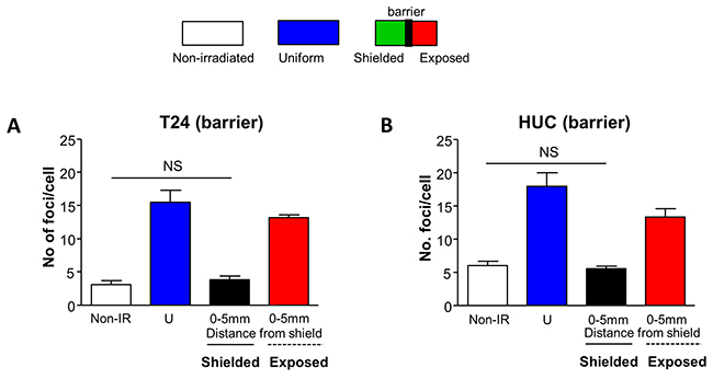 To investigate whether intercellular communication through transmitter release from irradiated cells contributed to bystander DSB in shielded regions, communication between shielded and exposed regions was physically inhibited. The bystander effect observed in Figure 1 was abolished in the shielded region for both T24 (Figure 2A) and HUC (Figure 2B) cells when communication was physically inhibited.