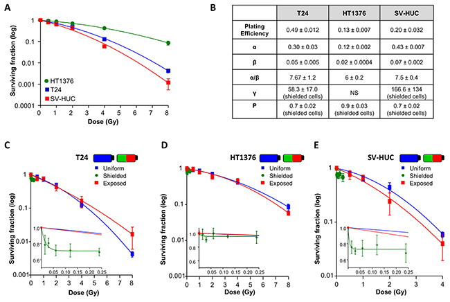Cell survival curves were fitted with Linear Quadratic (LQ) modelling (Figure 3B) which confirmed SV-HUC as the most radiosensitive (α=0.43±0.07) particularly >2Gy. T24 were also radiosensitive (α=0.30±0.03) >2Gy compared with the relatively radioresistant HT1376 (α=0.12±0.002), consistent with [18]. HUC radiosensitivity could not be assessed due to inability of these cells to form colonies.