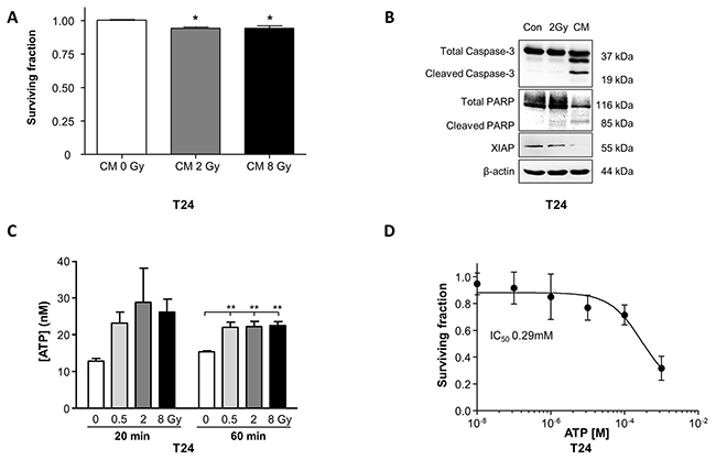 Figure 4: Radiation-induced bystander effects diminish cell survival of T24 cells. (A) Application of conditioned medium (CM) from irradiated (2Gy, 8Gy) T24 to non-irradiated cells significantly decreased clonogenic cell survival (N=3, p<0.05). Control experiments used CM from non-irradiated cells (Gy). (B) T24 cells that were directly irradiated (2Gy) or received CM from directly-irradiated cells (2Gy) were processed for Western blotting. CM evoked expression of cleaved caspase-3, cleaved PARP and reduced XIAP expression, consistent with activation of pro-apoptotic signaling (represents N=3). (C) ATP concentration was enhanced in CM obtained from cells 20 min post-irradiation at 0.5Gy, 2Gy and 8Gy and was significantly increased in CM obtained from cells irradiated at 0.5Gy, 2Gy and 8Gy (N=3, p<0.01) one hour post-irradiation. ARL67156 (50μM), an ectoATPase inhibitor, was included in these experiments to prevent ATP hydrolysis. (D) T24 clonogenic cell survival was concentration-dependently decreased by exogenous ATP treatment with an IC50 of 0.29mM (N=3).