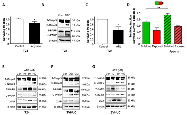 Figure 5: Radiation-induced bystander effects in urothelial cancer and normal urothelial cells is mediated by purinergic-signalling. (A) The ATP diphosphohydrolase, apyrase (10U/ml) significantly decreased T24 cell survival (N=3, p<0.05). (B) Apyrase (10U/ml) treatment increased expression of cleaved caspase-3 (C-Casp-3) and cleaved PARP (C-PARP). Total caspase-3 and total PARP are abbreviated to T-CASP-3 and T-PARP-3 respectively (represents N=3). (C) ARL67156 (100μM), an ectoATPase inhibitor decreased T24 cell survival (N=3, p<0.05). (D) In shielding protocols, the decreased survival of shielded cells was rescued by apyrase treatment N=3, p<0.01). Survival was corrected for apyrase effects on non-irradiated cells. (E) ATP activated pro-apoptotic signaling in a concentration-dependent manner with increased expression of cleaved caspase-3, cleaved PARP and decreased XIAP expression (N=3). (F) Similar experiments were performed on normal SV-HUC cells; directly irradiated cells had upregulation of cleaved caspase-3 and cleaved PARP. CM also increased expression of these proteins and also inhibited expression of XIAP. (G) The CM bystander effect on normal SV-HUC was mimicked by ATP treatment across a concentration range.