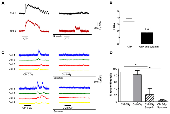 To examine whether conditioned medium (CM) from irradiated cells could evoke Ca2+-transients, CM from non-irradiated (0 Gy) or irradiated (8Gy, 1h after irradiation) cells was applied. Intensity-time plots for Ca2+-transients evoked by CM from control (0Gy) and 8Gy experiments are shown in Figure 6C. Both 0Gy CM and 8Gy CM evoked Ca2+ transients in recipient cells, consistent with the finding that ATP is released from non-irradiated cells and at a larger concentration from irradiated cells (see above). To determine whether the CM-evoked responses were mediated by purinergic signaling, CM from cells from control 0 Gy or 8 Gy irradiated cells was applied (applications were separated by a 10 minute wash) and subsequently, cells were incubated with suramin (10-4M) for 30 minutes. Suramin reduced the percentage of cells responding to both 0Gy from 90.4±6.2% to 21.5 ± 18.9% and 8Gy from 82.3±12.6% to 5.5±1% (8Gy) (N=3, n=72, Figure 6D).