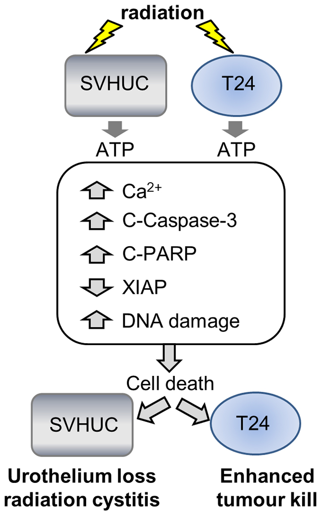 In conclusion, radiation activates bystander signaling in urothelial cancer cells which causes DNA damage, activation of pro-apoptotic pathways and reduced cell survival via ATP-purinergic, Ca2+-dependent mechanisms (Figure 7). This advantageous effect is accompanied by similar effects on normal urothelial cells, underpinning radiation-induced bladder toxicity and symptoms of radiation cystitis.