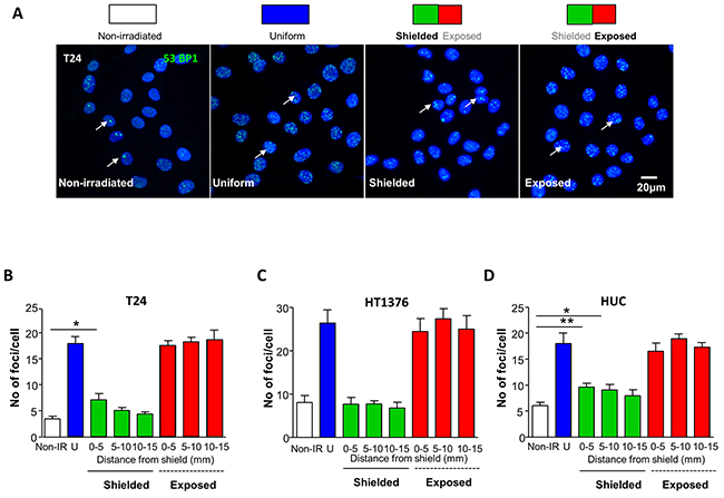 HT1376 urothelial carcinoma cells, had the expected increased foci in uniformly-irradiated vs non-irradiated flasks (Figure 1C), however, similar numbers of foci per nucleus in shielded regions vs non-irradiated cells were observed (p>0.05) indicating absence of a bystander response.