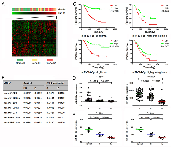 Figure 1: MiR-524-5p and miR-324-5p were identified as key EZH2 specific miRNAs. (A) Heatmap of EZH2 and EZH2 associated miRNAs in glioma patients sorted by level of EZH2 expression in CGGA data. (B) Seven EZH2 specific miRNAs confer a better prognosis in GBM patients. (C) Kaplan-Meier survival curves for miR-524-5p and miR-324-5p in all gliomas and high grade gliomas. Patients with low levels of miR-524-5p or miR-324-5p had a significantly worse outcome. (D) Levels of miR-524-5p and miR-324-5p were analyzed in different glioma tissues in CGGA data. (E) Levels of miR-524-5p and miR-324-5p were analyzed in normal brain tissues and glioma tissues by PCR.