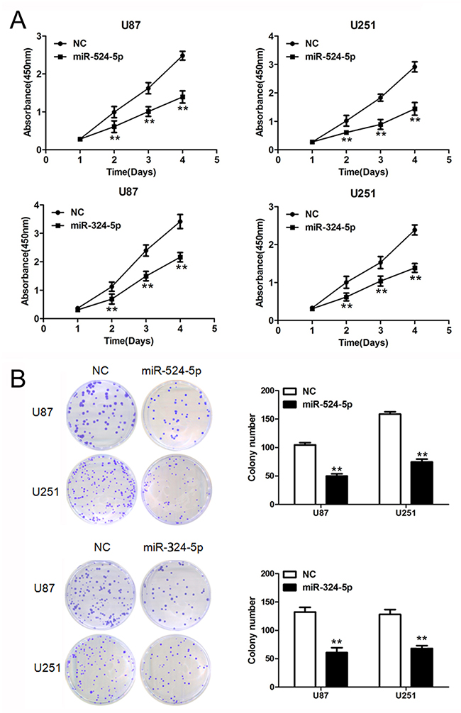 Figure 2: Overexpression of miR-524-5p or miR-324-5p inhibits tumor growth in vitro. (A) Cells were treated with miR-524-5p or miR-324-5p mimics, and subjected to MTT assay. Data are presented as the means of triplicate experiments. (B) Cells were treated with miR-524-5p or miR-324-5p mimics, and subjected to colony formation assay. Data are presented as the means of triplicate experiments, ** P <0.01.