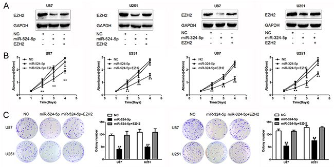 Figure 4: EZH2 is crucial for miR-524-5p and miR-324-5p signaling in glioma. (A) Western blot analysis of lysates from cells transfected by miR-524-5p or miR-324-5p mimics alone, or in combination with EZH2 cDNA probed with EZH2 antibody. GAPDH was served as the loading control. (B and C) MTT and colony formation assays were measured in U87 and U251 glioma cell lines after the cells were treated with miR-524-5p or miR-324-5p mimics alone, or in combination with EZH2 cDNA. Results are representative of at least three independent experiments, ** P <0.01.