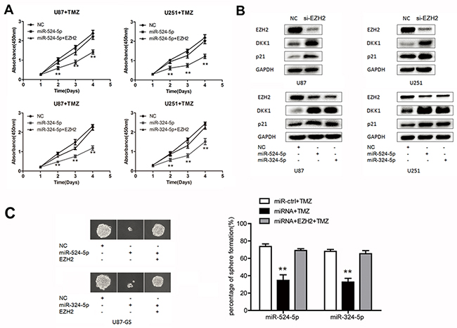 Figure 5: MiR-524-5p and miR-324-5p increases TMZ chemosensitivity in glioma. (A) MTT assay was measured in U87 and U251 glioma cell lines by TMZ treatment after the cells were transfected with miR-524-5p or miR-324-5p mimics alone, or in combination with EZH2 cDNA. (B) Western blot analysis of lysates from cells transfected by si-EZH2, miR-524-5p or miR-324-5p mimics probed with EZH2, DKK1 and p21 antibody. GAPDH was served as the loading control. (C) Clonogenic assay was used to measure the sphere formation of glioma stem-like cells treated TMZ for 15 d. Representative photomicrographs of new clonal sphere (left) and statistical analysis of the percentage of positive wells (right). Results are representative of at least three independent experiments, ** P <0.01.