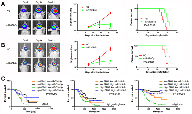 Figure 6: MiR-524-5p suppresses tumor growth in an intracranial xenograft model. (A, B) U87 cells pretreated with lentivirus containing a luciferase reporter were implanted into the brains of nude mice, and tumor formation was assessed by bioluminescence imaging. Changes in bioluminescent signal were detected at days 7, 14, and 21 after implantation. Overall survival of nude mice was determined by Kaplan–Meier survival curves and log-rank test was used to assess the statistical significance of the differences. * P <0.05, ** P <0.01. (C) Combining analysis of miR-524-5p and EZH2 expression by Kaplan-Meier survival curves in different glioma patients of CGGA data.