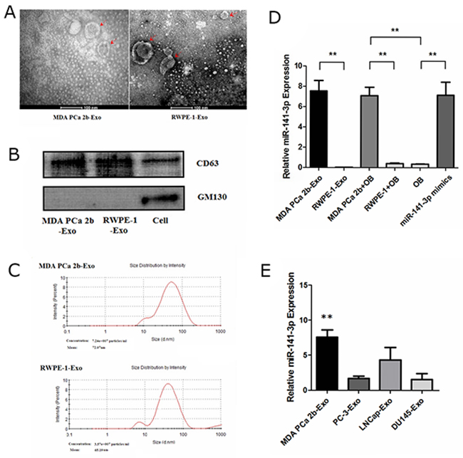 We incubated MDA PCa 2b cells (a PCa bone-metastasis cell line) and RWPE-1 cells (human prostatic epithelial cells) in exosome-free medium generated from exosome-free FBS. Exosomes were isolated from cell culture medium collected after 48 h by differential centrifugation as described previously [14]. To examine the size distribution and morphology of the isolated exosomes, the exosome pellets were resuspended in PBS and then examined by nanoparticle tracking analysis and transmission electron microscopy. The isolated exosomes appeared as uniformly round or oval membrane vesicles (Figure 1A) with sizes within the characteristic diameter range of 30-120 nm (Figure 1C). The shape and size of the exosomes were consistent with reported exosome characteristics [15]. To further characterize the isolated exosomes, we used the exosomal protein marker CD63 and the cis-Golgi marker GM130, which is only present in cell lysates. As shown in Figure 1B, the isolated exosomes were positive for the exosomal marker CD63 and negative for the cis-Golgi marker GM130. These results confirmed that the vesicles isolated from the conditioned media were exosomes based on their morphology, size and marker protein expression.