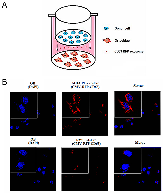 Figure 2: Transfer of MDA PCa 2b cells -derived exosomal miR-141-3p to osteoblasts. (A) Schematic diagram illustrating the design of co-culture experiments. (B) Representative confocal images of CD63-RFP-exosome by donor cells at 72 h after co-culture.