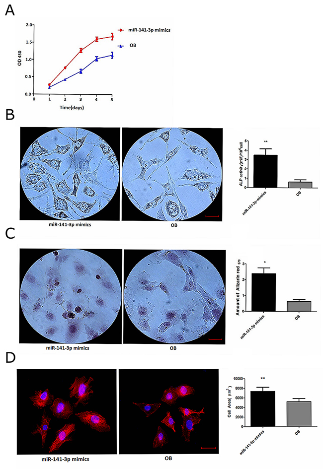 Figure 3: miR-141-3p promotes osteoblast activity. (A) Osteoblast proliferation. (B) Alkaline phosphatase activity in osteoblasts. (C) The level of extracellular matrix mineralization in osteoblasts. (D) Osteoblast adhesion. Scale bars, 25 μm.