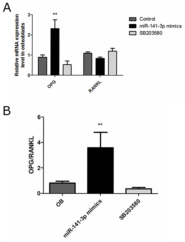 Figure 4: OPG, RANKL expression in osteoblasts. (A) OPG and RANKL expression. (B) OPG/RANKL in osteoblasts.