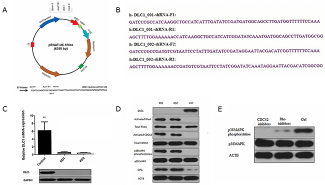 Figure 6: DLC1 inhibition is critical for mir-141-3p to activate the p38MAPK pathway. (A) pRNAT-U6.1/Neo expression vector. (B) Two shRNA constructs and the corresponding primers. (C) Two shRNA constructs stably silence DLC1 in osteoblasts. (D) DLC1 KD activated RhoA and CDC42 and affected p38MAPK phosphorylation. (E) CDC42 inhibition significantly affected p38MAPK phosphorylation.