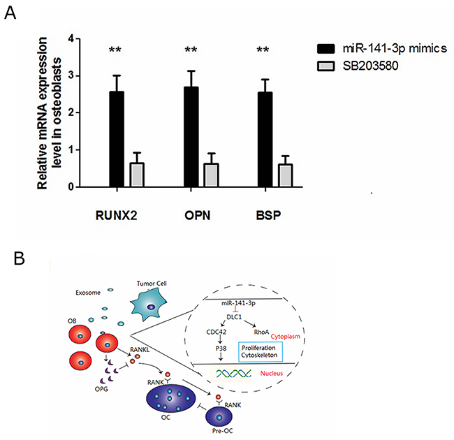 Figure 7: miR-141-3p-promoted osteoblast activity is p38MAPK dependent. (A) Expression of osteoblast activity-related marker genes in osteoblasts. (B) DLC1-p38MAPK signalling in prostate cancer bone metastasis.