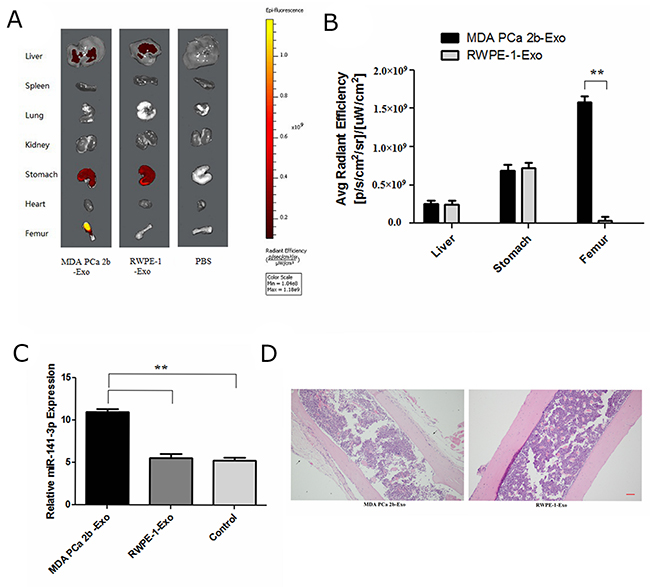 Next, we conducted an in vivo experiment to investigate whether exosomal miR-141-3p could be transferred to the bone and regulate osteoblast activity. In this study, fluorescent-tagged exosomes allowed direct in vivo visualization to determine its systemic biodistribution. Here, we report that exogenously administered (intravenous) exosomes from MDA PCa 2b distributed predominately to the bone, a frequent site of PCa metastasis. Exosomes from MDA PCa 2b cells also distributed to both the liver and stomach, but showed no significant difference from exosomes from RWPE-1 cells; this phenomenon was analysed for non-specific expression. Fluorescent-tagged exosomes and HE staining of bone showed that exosomal miR-141-3p from MDA PCa 2b cells had bone-target specificityand promoted osteoblast activity.