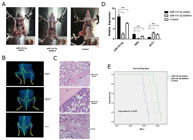 We next examined whether exosomal miR-141-3p had the ability to promote the bone metastasis of PCa. We transfected MDA PCa 2b cells with miR-141-3p mimics/inhibitor. Six-week-old male BALB/c nude mice were divided into three group and respectively intravenously injected with exosomes from PCa cells transfected miR-141-3p mimics (A group), exosomes from PCa cells transfected miR-141-3p inhibitor (B group), and exosomes only from PCa cells (C group, control), three times a week (each time, 100 μg per mouse). At 3 weeks after the injections, the animals respectively received 2.0×106MDA PCa 2b cells transfected with miR-141-3p mimics (A group)/inhibitor (B group) and only MDA PCa 2b cells (C group, control) via intraosseous injection. Mice injected with miR-141-3p mimics developed apparent bone metastases compared with those injected with the miR-141-3p inhibitor and the control at 4 weeks after injection (Figure 9A). Micro-CT showed that the right femur/tibia formed visible metastases in mice injected with miR-141-3p mimics, with increased shadow density on the bone background; the bone shape had no obvious change (Figure 9B). HE staining of bone showed osteogenic changes, and there was a large amount of osteoblasts and osteogenesis with tumour characteristics in the limbic cortex. The tumour cells were closely aligned, with loss of polarity and an imbalance of the nuclear to cytoplasmic ratio, and there was increased pathological nuclear fission (Figure 9C). There was a significant increase in the level of miR-141-3p and OPG and a significant decrease in DLC1 in the distal femur of mice treated with miR-141-3p-mimic exosomes (Figure 9D). The median survival times in the three groups (miR-141-3p mimics, miR-141-3p inhibitor and control) were 42, 60, 51, and the log-rank method test showed significant differences in the survival times of the three groups (χ2 = 9.701, P = 0.02). The mice injected with miR-141-3p mimics exhibited a significantly shorter survival time (Figure 9E). Collectively, these results indicate that exosomal miR-141-3p promotes osteoblastic metastasis in vivo.