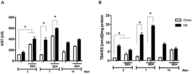 Figure 1: Cholesterol overload in the liver exacerbates the damage induced by N-nitrosodiethylamine. Mice were subjected to both high cholesterol (HC) or Chow diet and two days later received, or not, a single dose of N-nitrosodiethylamine (DEN, 10 μg/g body weight), serum and liver tissue were recovered at 2, 7 and 14 days after DEN treatment. (A) Serum aspartate aminotransferase (AST) activity, and (B) lipid peroxidation determination assayed by thiobarbituric acid reactive substances (TBARS). Each column represents the mean ± SEM in at least five different mice. *, p ≤ 0.05.