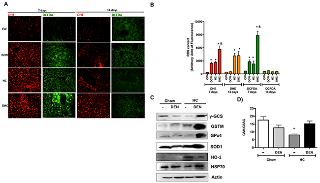 The assessment of some of the main protective and antioxidant proteins revealed an adaptive response in DHC mice (Figure 2C). Remarkably, the levels of GSH-related enzymes such as γ-GCS, GSTM and GPx4 increased in the DHC group (densitometric analysis in Supplementary Figure 2), suggesting that GSH system is required for this kind of damage as we and others previously reported [11, 14, 18]. Interestingly, the GSH to GSSG ratio determined at day 7 exhibited a significant decrease in livers from HC fed animals, but HC and DEN treated mice show similar values of GSH than control Chow (Figure 2D), this finding agrees with γ-GCS content observed in HC-DEN group, other antioxidant and protective enzymes such as SOD1, HO-1 and HSP70 were also increased in this group comparing with Chow and Chow-DEN animals.