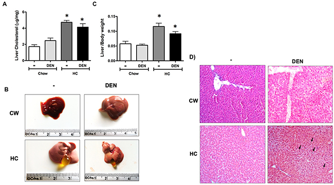 Figure 3: Macroscopic and microscopic inspection of the liver under HC diet and DEN treatment. (A) Cholesterol content in liver tissue. (B) Macroscopic aspect of the liver from different groups. (C) Liver to body weight ratio. Each column represents the mean ± SEM in at least four different mice. *, p ≤ 0.05 vs Chow control animals. (D) Histology appearance by H&E staining, arrows show cells with mitogenic activity corroborated by chromatin distended nuclei. Images are representative of at least 4 different mice, original magnification X200.