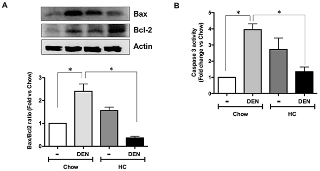 Although there is an increment in antioxidants enzymes and GSH in animals under HC diet and DEN treatment, ROS content is significantly increased as well, suggesting an inefficient antioxidant response. This sustained pro-oxidant environment could promote apoptosis. To assess the apoptosis status in the respective groups, we assayed Bax to Bcl2 expression ratio in the livers. As expected, DEN treatment led to a significant increase in the ratio in animals treated with chow diet. However, HC fed animals treated with DEN showed a striking activation of Bcl-2 and concomitant downregulation of Bax (Figure 4A). Apoptosis was corroborated by caspase 3 activity in whole liver homogenate (Figure 4B) observing a decrease in caspase 3 activity in HC fed animals treated with DEN comparing with Chow-DEN. Thus, these data suggest that the HC diet induces apoptosis resistance that might facilitate a cell transformation due to an unresolved cell damage.